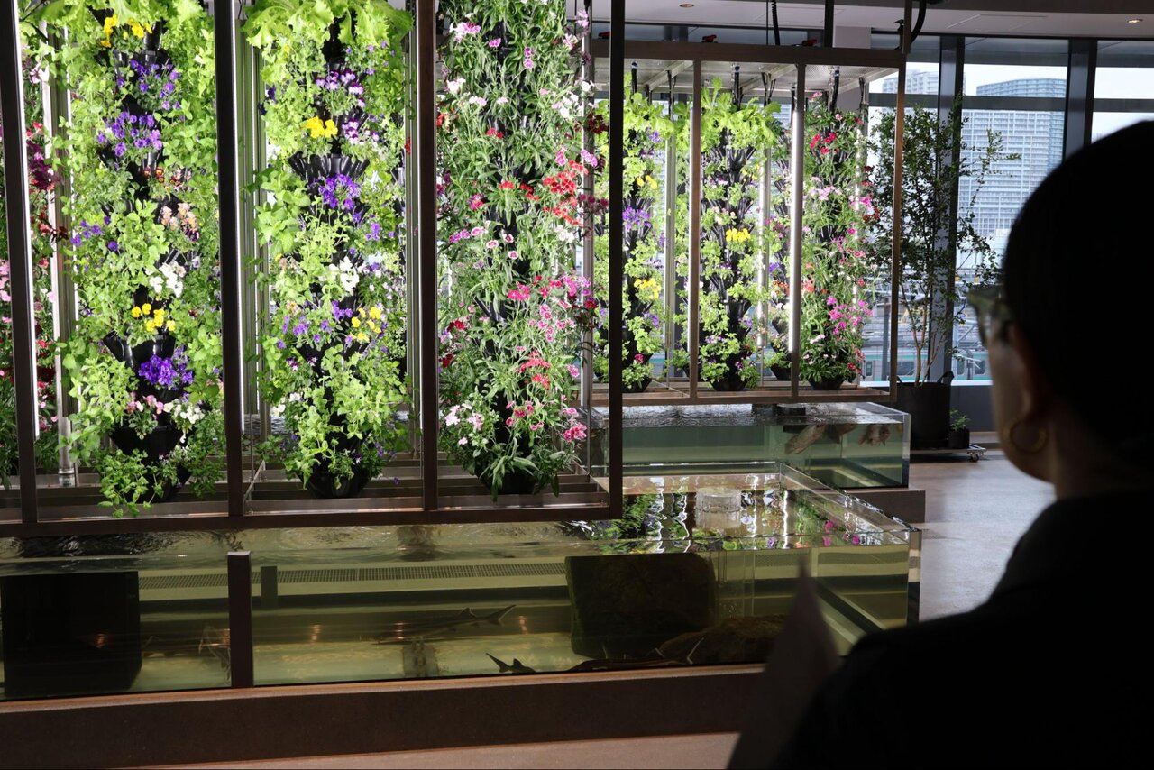 遠目から見ても非常に美しい「AGRIKO×MIMURE BOTANICAL Lab(アグリコ カケル ミムレ ボタニカルラボ)」は、ミントなどのハーブの水耕栽培と魚の養殖を組み合わせた「アクアポニックス」という循環型農業システムを使った都市型農園。