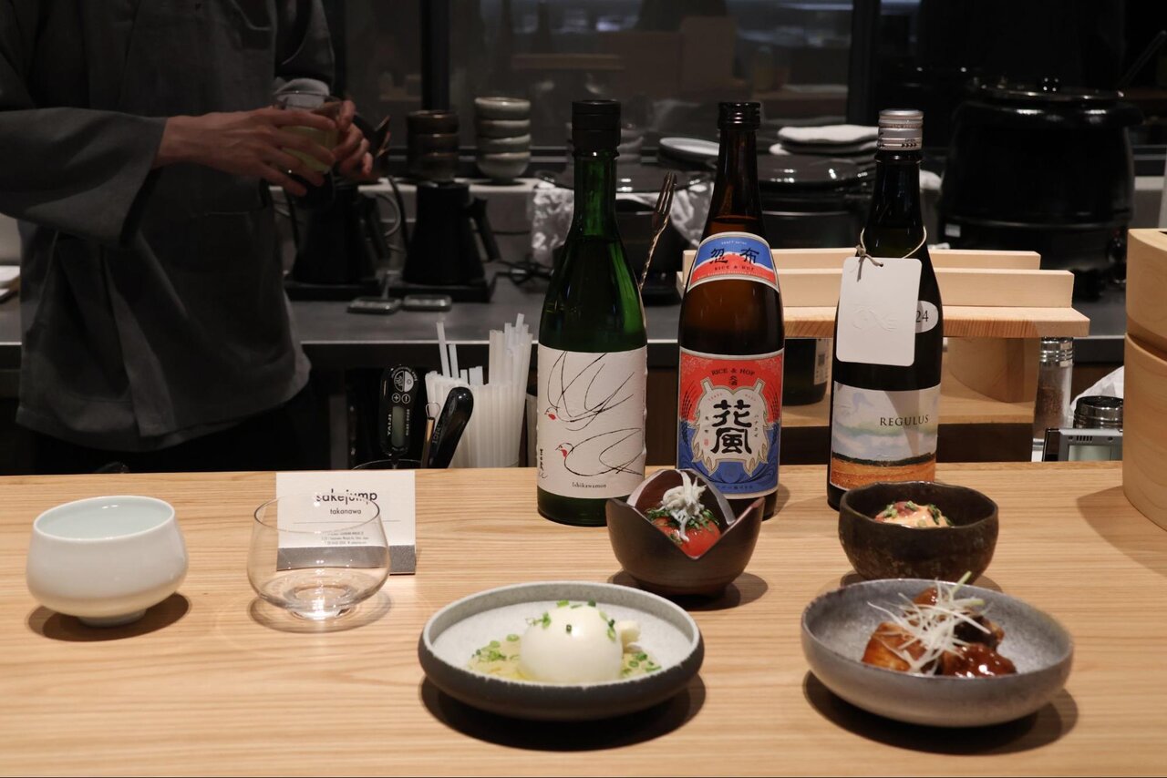 sakejump takanawaでは日本各地の貴重な日本酒を試飲しながら購入できる。カウンター席で料理とともにいただくことも可能