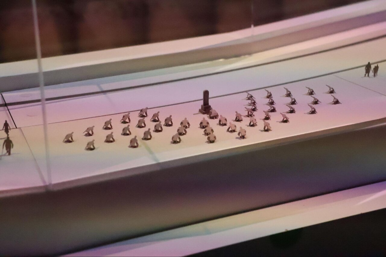 山手線の「ぐるぐる」と各駅の特徴を表したペーパークラフト。高輪ゲートウェイは、忠臣蔵の聖地ともいえる泉岳寺にちなんで浅野長矩の墓に集まる赤穂浪士たちが表現されていた