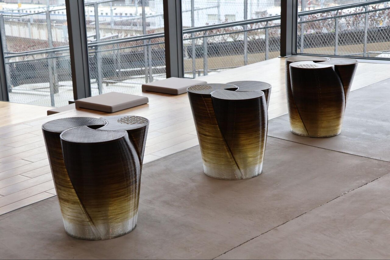 大阪・関西万博の日本館に展示されていた「藻類スツール」。藻類由来のプラスチックを3Dプリンターで加工したもの。なんともいえないグリーンと透明感が目を引く。MoN Takanawaの自然光ともマッチして大変美しい