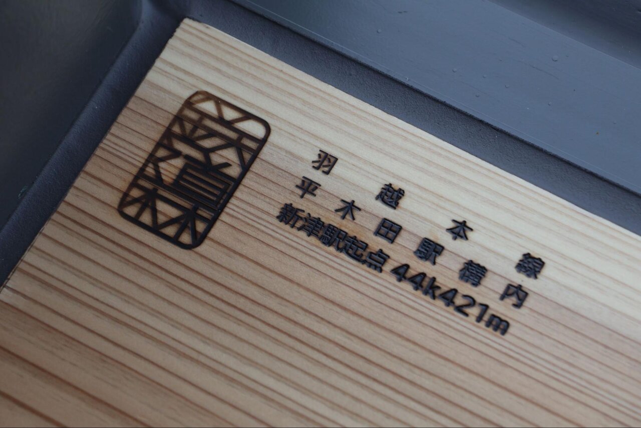 館内の木製ベンチには、自然災害から路線を守る目的で線路脇に設置された「鉄道林」の木材であることを示すサインが