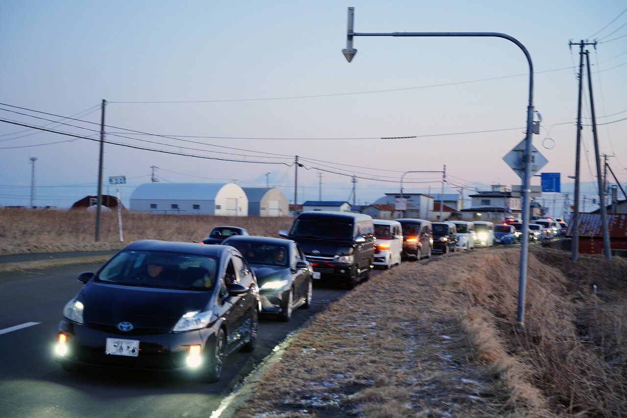 ですが、目的地の納沙布岬が近づくにつれて状況が不穏に。もうすぐ到着というタイミングで、道内では札幌でしか観察されないレベルの大渋滞に遭遇したのです。そして、道路で案内を行っている方から「5時半で駐車場がすべて埋まりました」との非情な宣告がされました。これにより、納沙布岬灯台のある岬の最東端に行けないことが確定したのです。