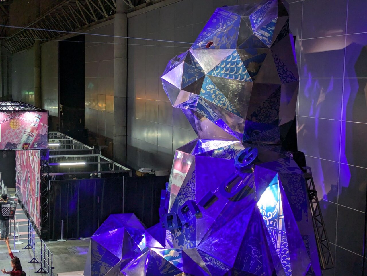 ソニッくまとは、端的に説明すると「ものすごく大きくて金属っぽい質感の派手なクマ」です。GMO SONIC 2023と2024ではステージど真ん中の天井あたりに飾られ、シンボル然とした存在感がありました。