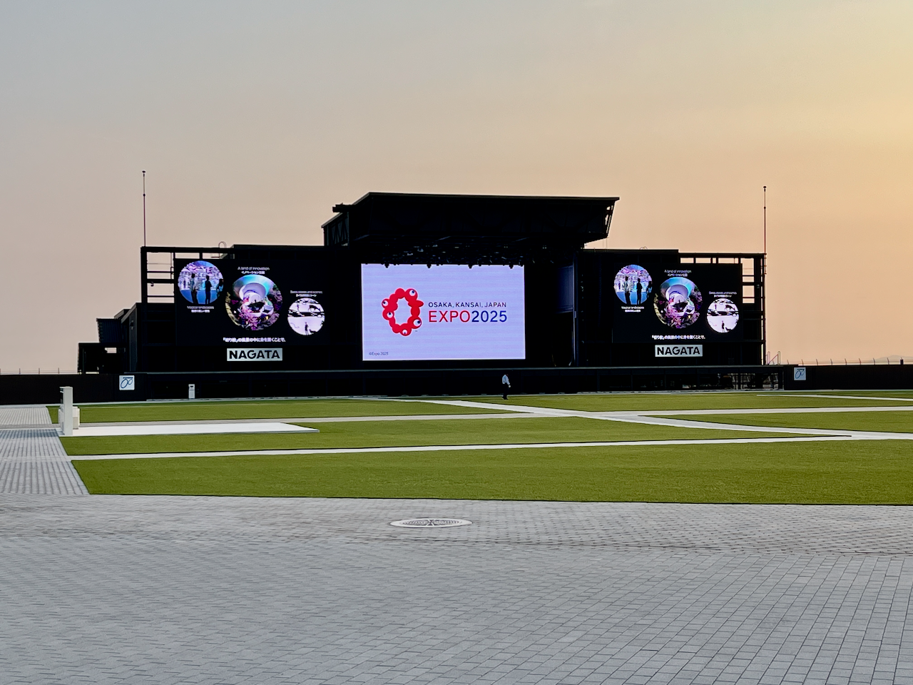 EXPOアリーナにも、コンクリートが固まる過程でCO2を吸収し、コンクリート内部に固定することでCO2排出量を実質ゼロ以下にできる環境配慮型コンクリートブロックが使われ、緑の芝生とバランスよく会場を演出していました。