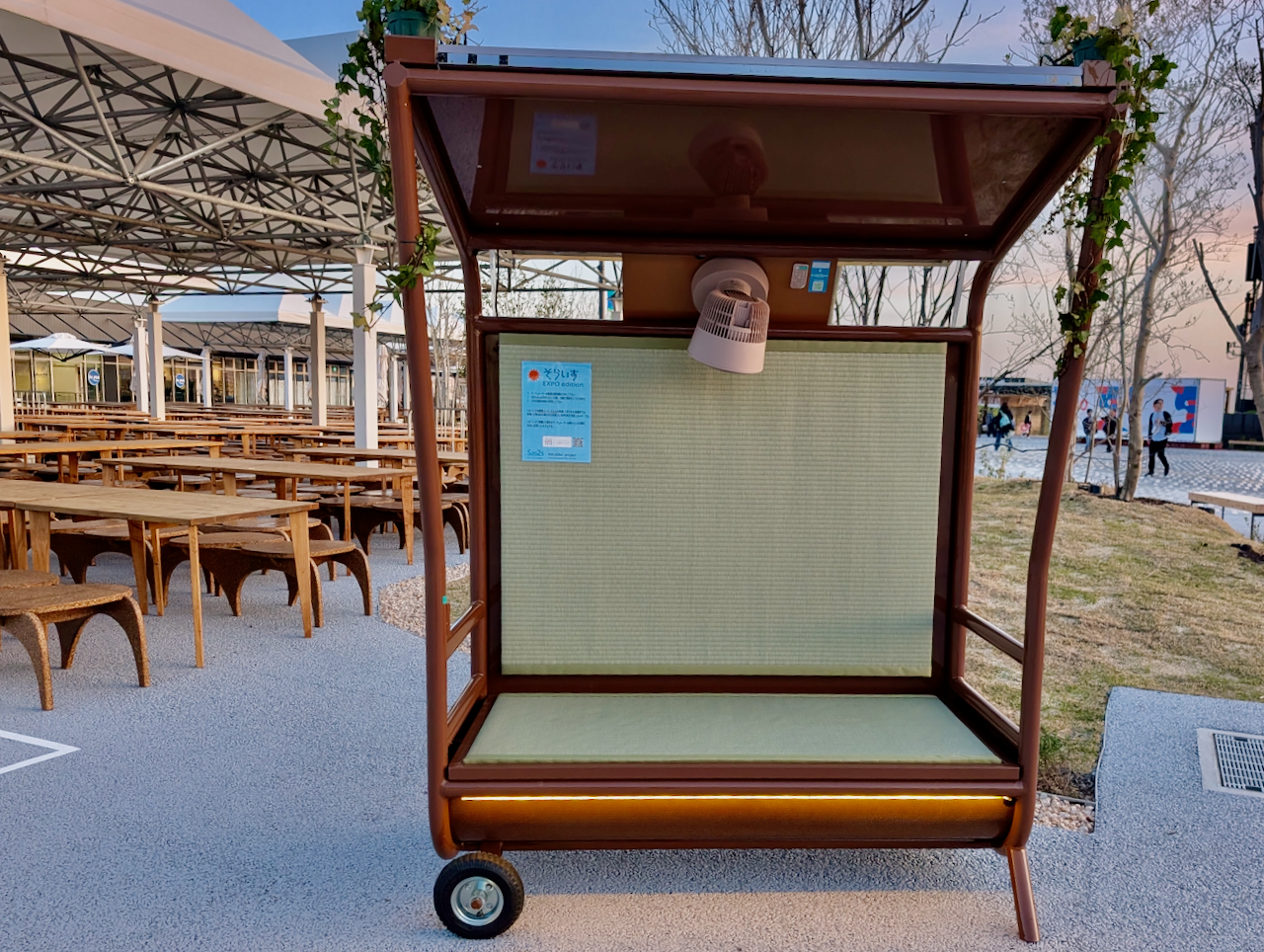 新しい技術だけでなく、既存のソーラーパネルをリサイクルするアイデアも登場しました。太陽光発電パネルを再利用した「そらいす」は、扇風機付きで充電もできるマルチな屋外ベンチ。さらに移動も可能なため、災害時の非常用電源としての活用も想定されています。