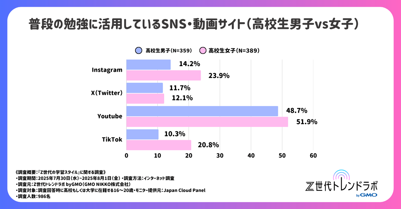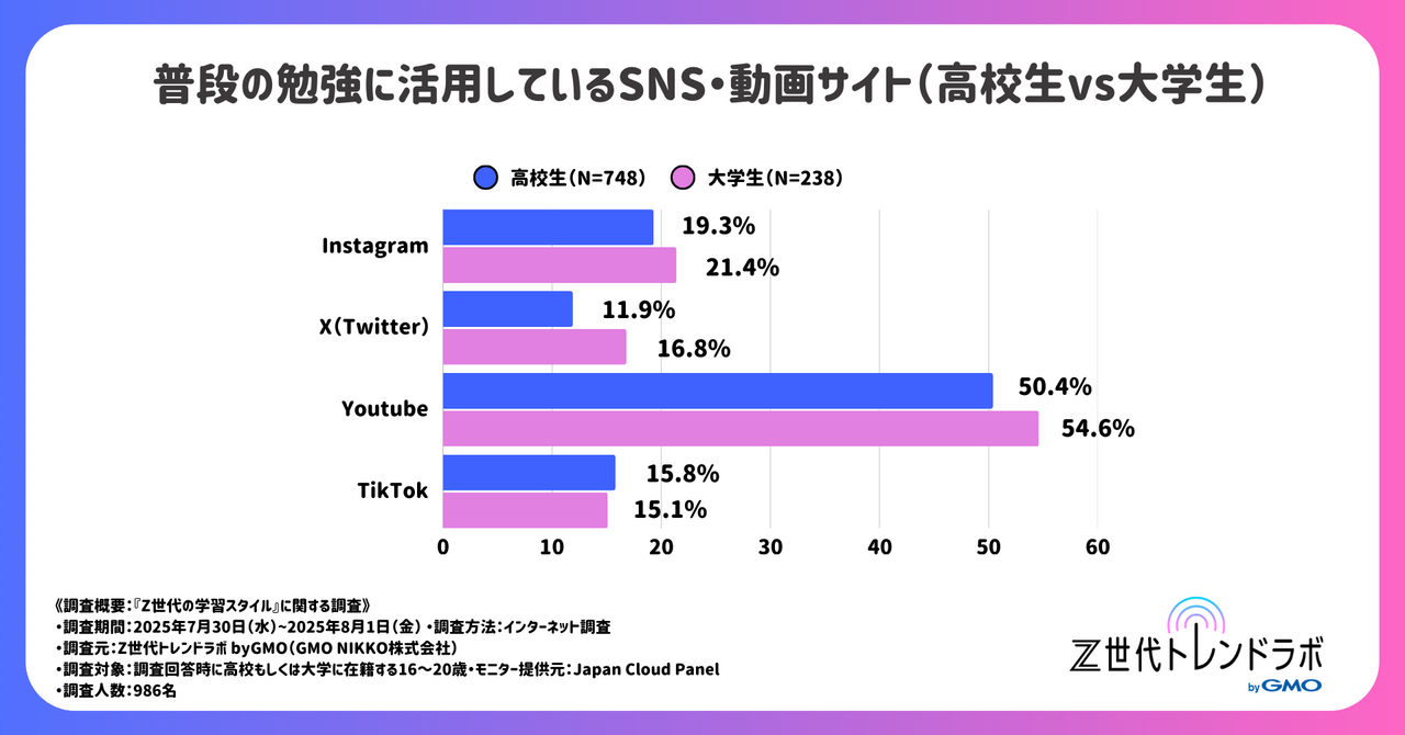 GMOインターネットの連結子会社で総合マーケティング支援事業を展開するGMO NIKKOが提供する「Z世代トレンドラボ byGMO」では、高校生・大学生986人を対象に「Z世代の学習スタイルに関する自主調査」を実施しました。