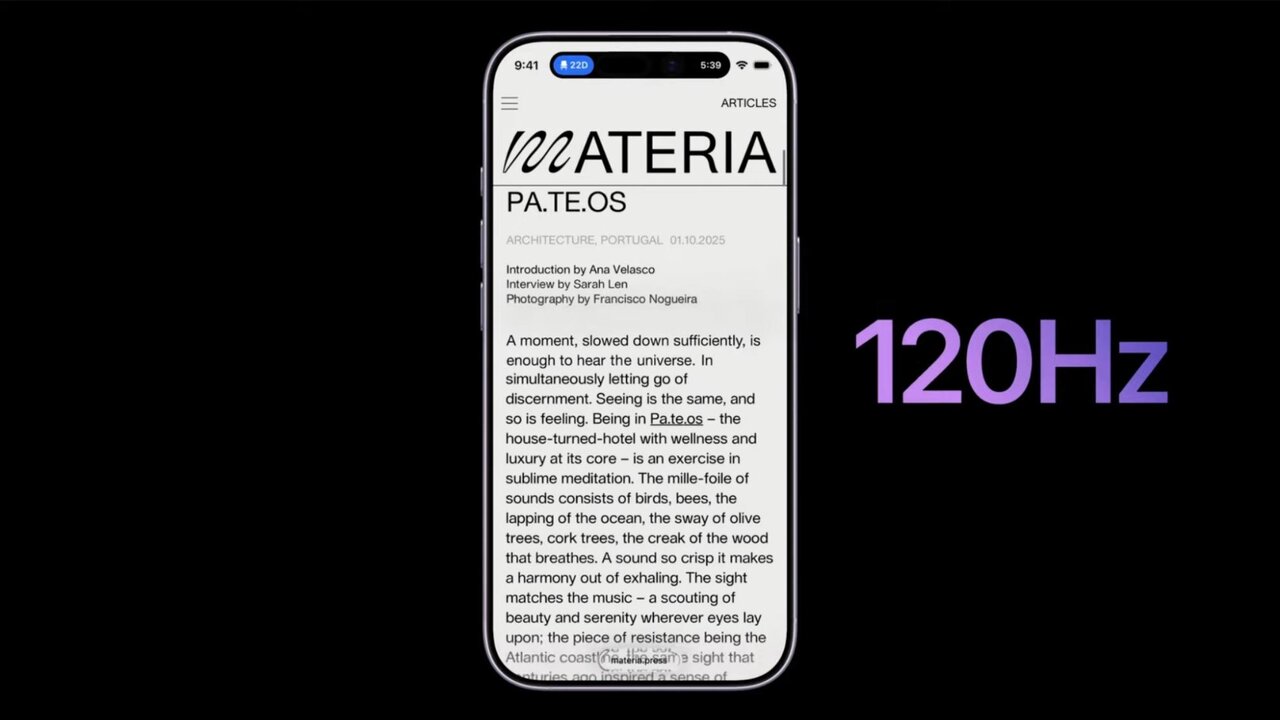 ディスプレイは待望のProMotionに対応。リフレッシュレート(1秒間の画面更新回数)が従来の60Hzから最大120Hzになり、スクロールや画面の切り替えがなめらかになりました。更新回数は必要に応じて自動調整され、例えば、素早くスクロールしたときには更新回数が増え、遅くスクロールすると更新回数が減るので、消費電力を抑えることができます。