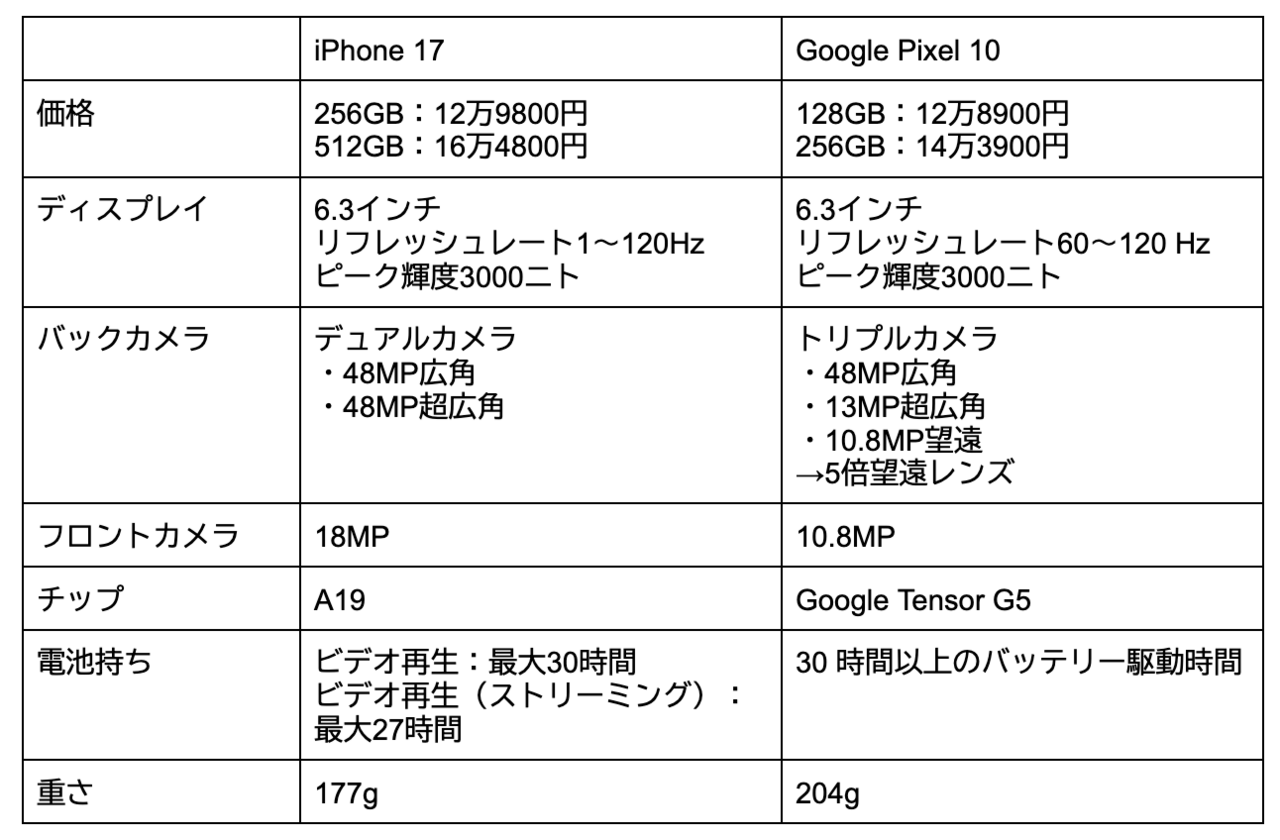 Google Pixelシリーズで競合となるのは同じ画面サイズのGoogle Pixel 10です。