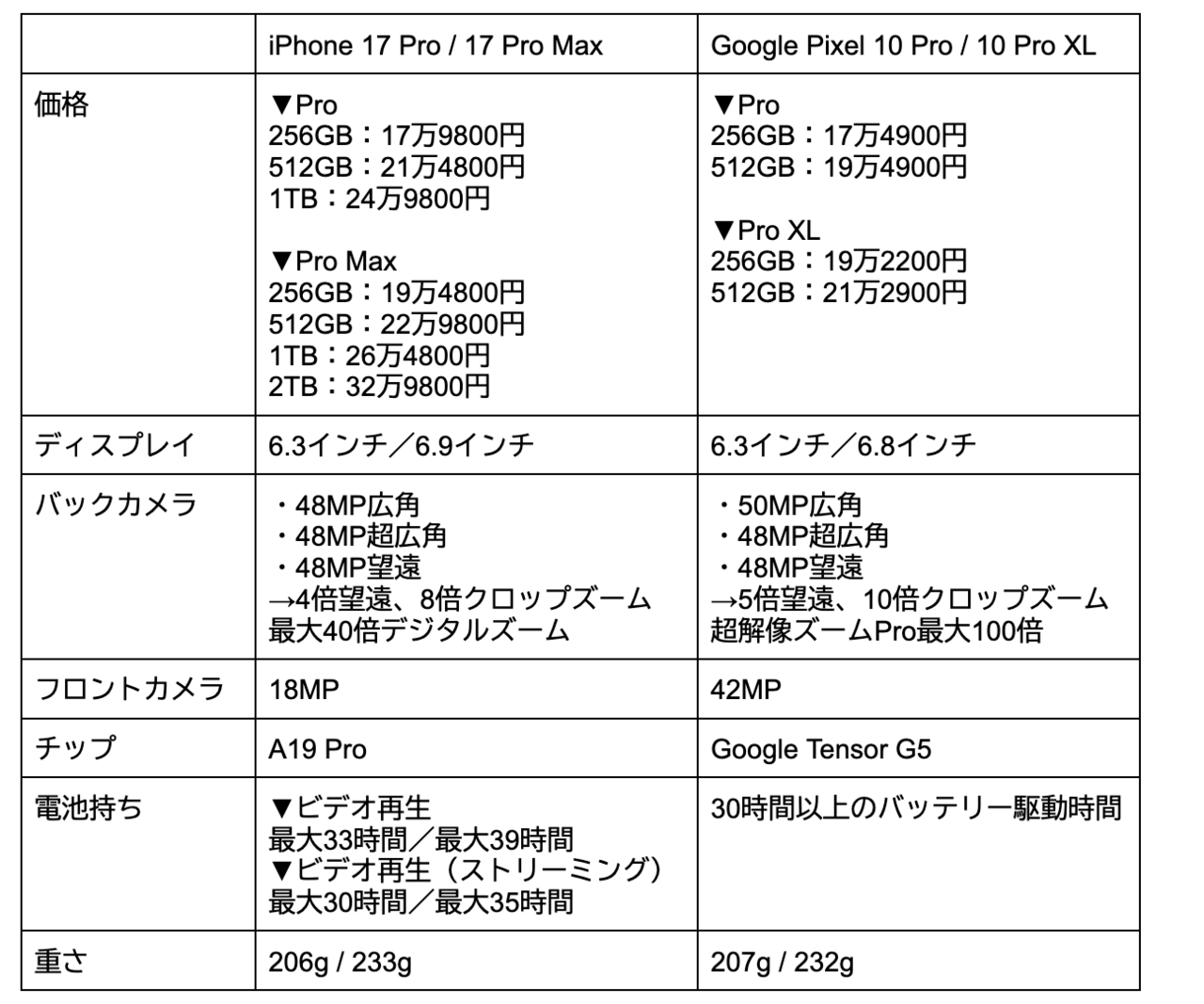 本格的な撮影、特に動画撮影を行うならiPhone 17 Pro / 17 Pro Max、よりカジュアルに撮影を楽しみ、ファッショナブルなデザイン性も楽しみたい人にはGoogle Pixel 10 Pro / 10 Pro XLが最適な選択になりそうです。