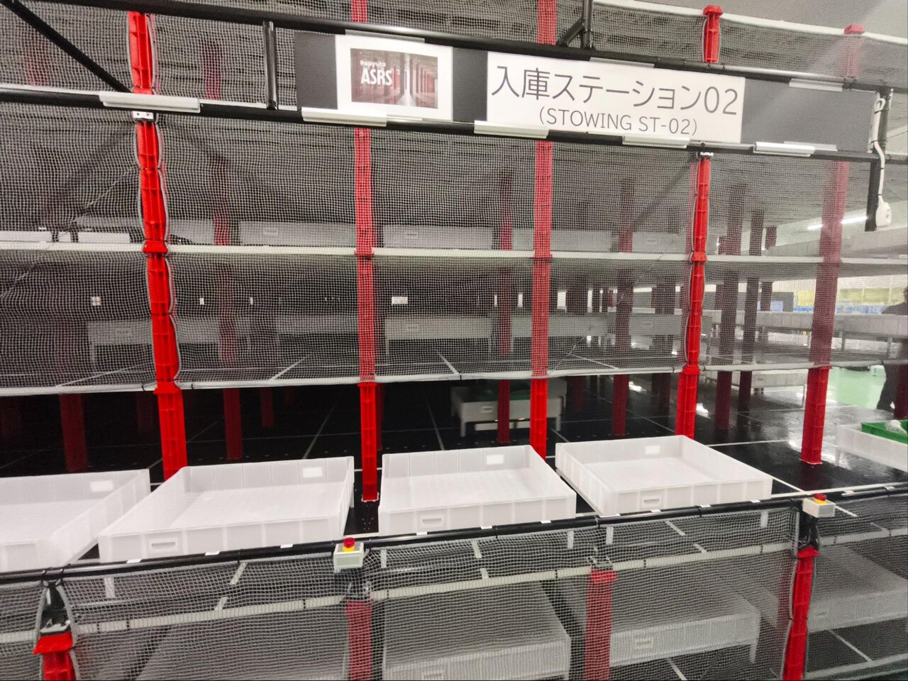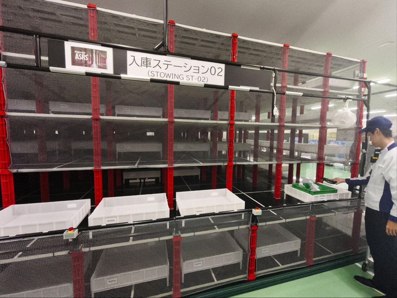 さらに、シェーバーの刃や樹脂成形部品など、組み立て工程で必要な基幹部品である「仕掛在庫」を保管する場所では、スペースと作業の両方を効率化する目的で、ラピュタロボティクスが開発した「ラピュタASRS」という自在型自動倉庫を本格稼働開始に向けてテストしていました。