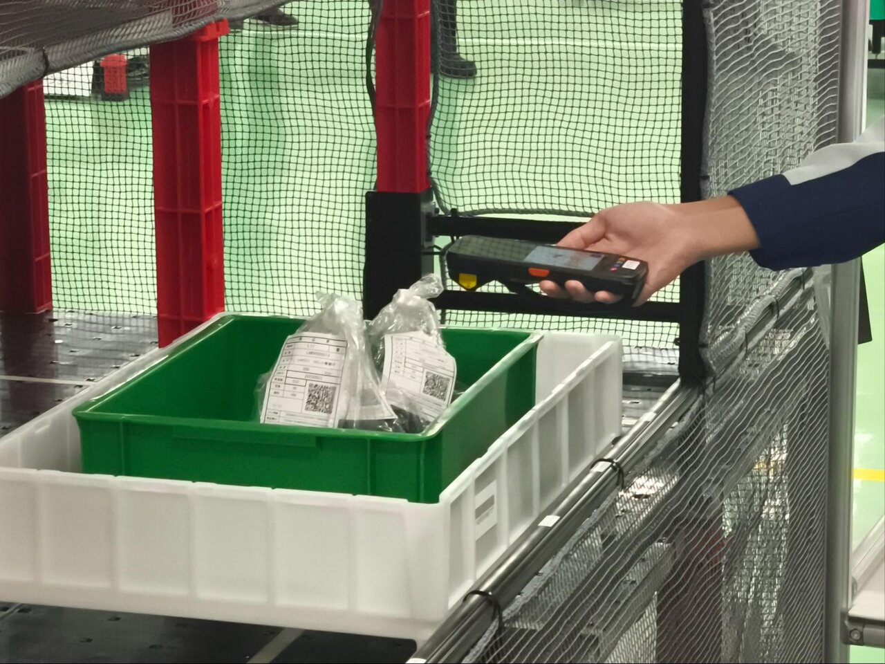 仕掛品の保管は、ビンに載せてから端末で2次元コードを読み込むだけで行えます