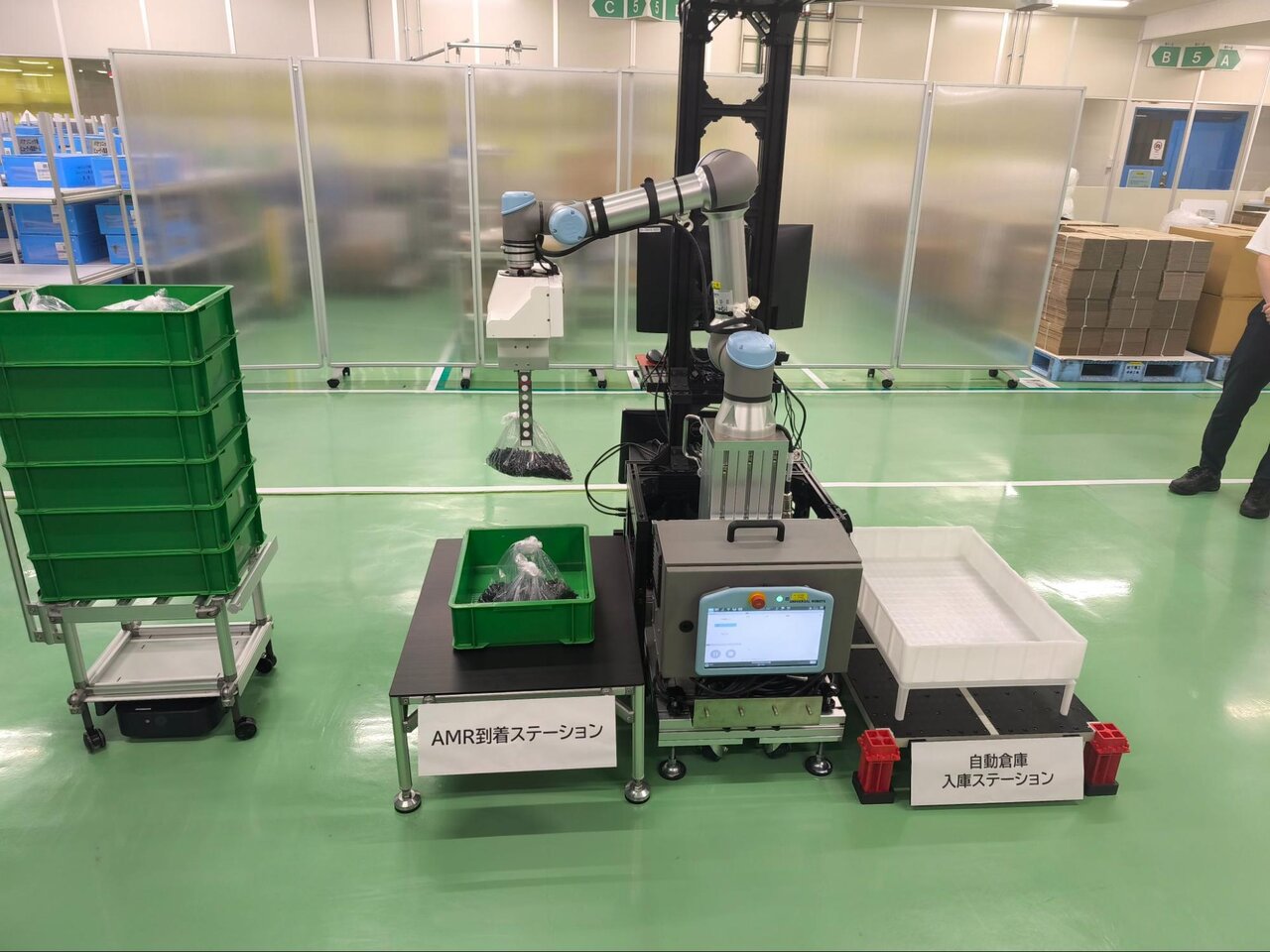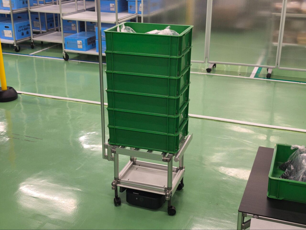 ロボットを用いた自動化のデモ。Preferred Roboticsが開発したAMRの「カチャカ」を用いて、仕掛品をAMR到着ステーションまで搬送します