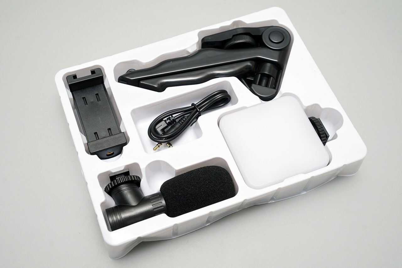マイクライト付三脚は、マイク、LEDライト、スマートフォンホルダー、ミニ三脚がセットになった商品なのですが、筆者は、この中からLEDライトとスマートフォンホルダーをメインで使用しています。