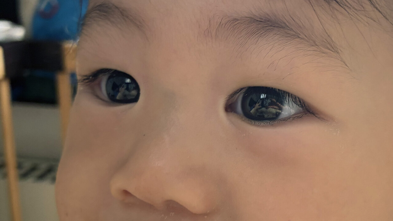 キャッチライトを作った例。スマートフォンで撮影した息子の黒目に、しっかり白いLEDライトが映り込んでいます