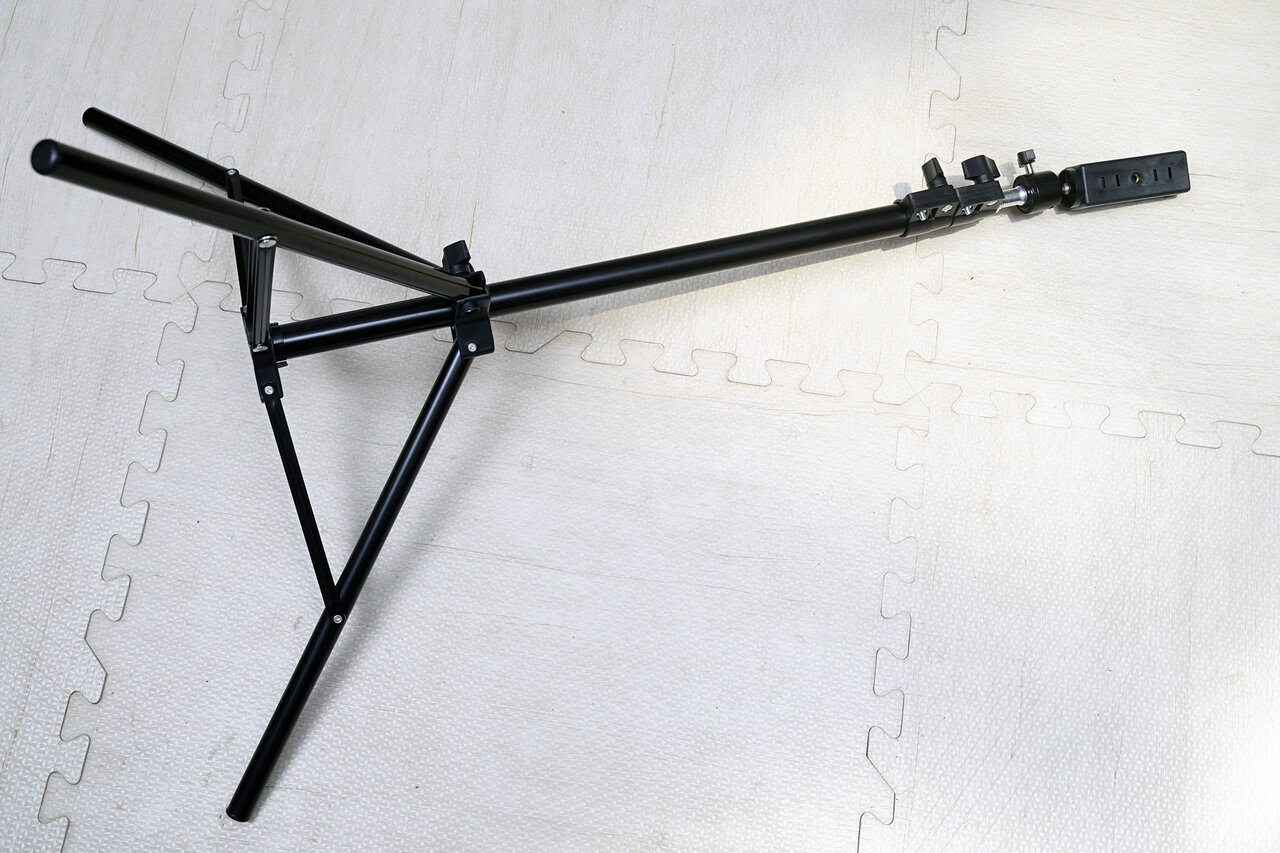 「自立式一脚」という聞き慣れない名称ですが、実際のところこの製品は、一般的なカメラ用品の名称でいうならライトスタンドにミニ雲台(一脚とカメラの間に設置して、カメラの向きや角度を調整・固定する器具)とスマートフォンホルダーがセットになったものです。
