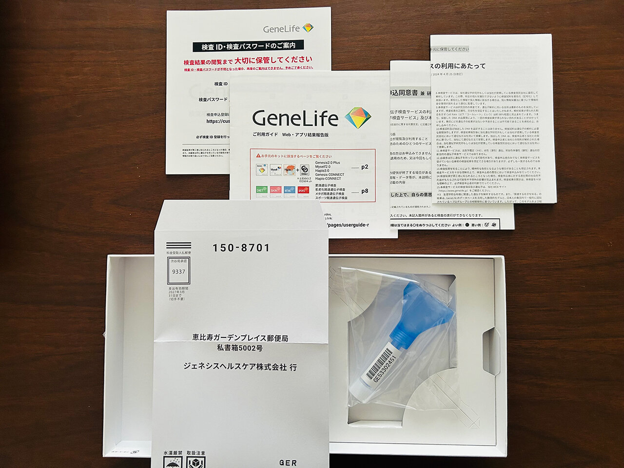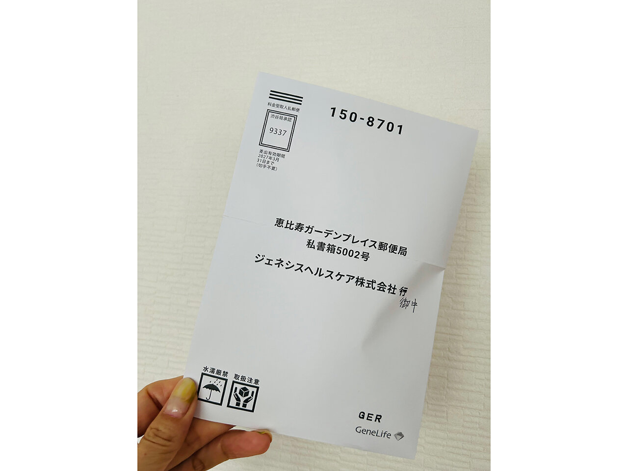 さて、ジーンライフとは、ジェネシスヘルスケアが提供する国内最大級の遺伝子検査キットシリーズ。2001年にサービスを開始した業界のパイオニアで、累計解析実績は290万人超、国内シェア約73%を占めるNo.1ブランドだ。ネットで購入したキットが到着するのはほんの2、3日後。まずは登録画面で検査申込登録をし、キットに入っている同意書に署名を記入、採取キットのチューブに自分の唾液を採取し、一度採取した唾液はできるだけ早く返送用封筒に入れて郵送する(ポスト投函でOK、切手不要!)。