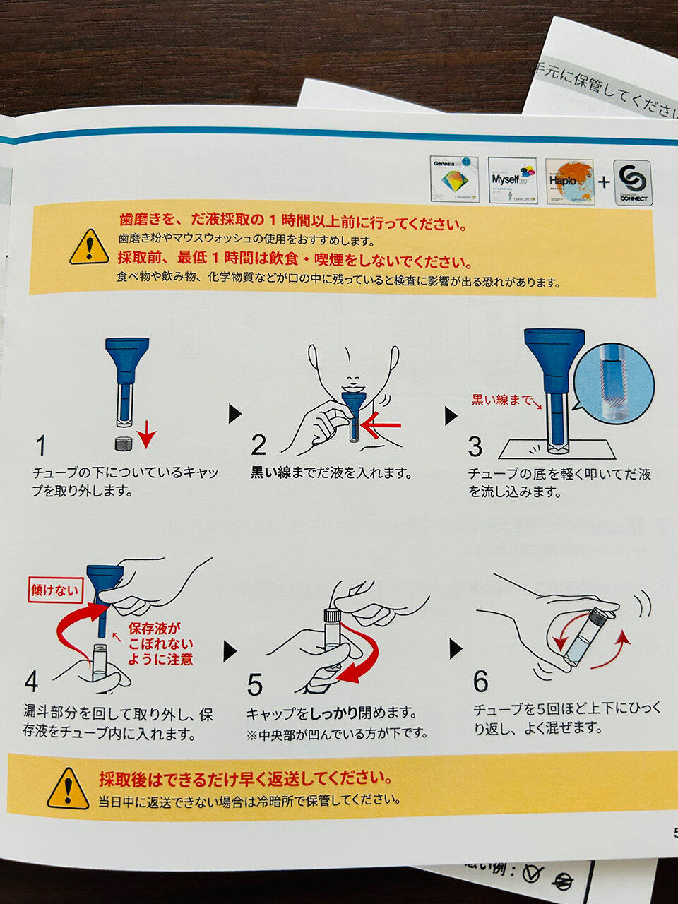 新鮮(笑)で混ざり物のない唾液が大切な試料となるため、採取の1時間以上前に歯磨き粉やマウスウォッシュを使って歯磨きをし、最低1時間は飲食や喫煙をしない。チューブ内に採取した唾液は、当日中に返送できない場合は冷暗所で保管したほうがいいとのことだ。