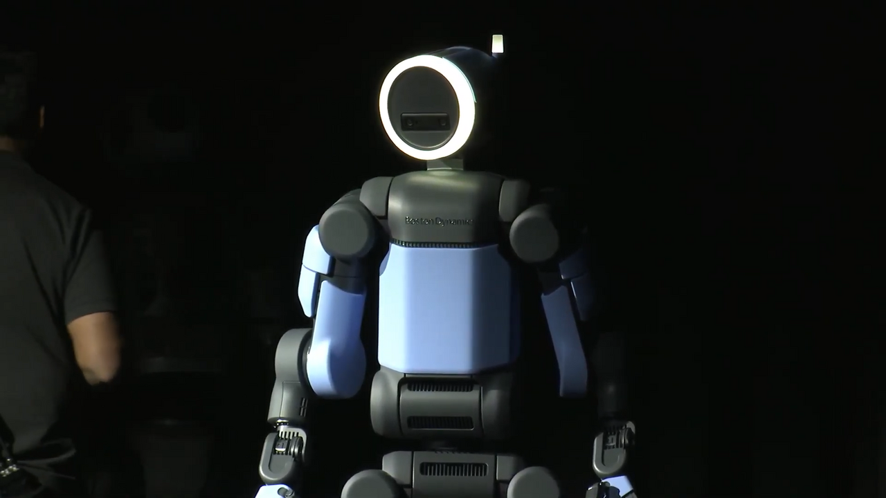 これまでBoston Dynamicsは、動画でバク転、パルクール、箱の上でのジャンプといったAtlasのパフォーマンスを披露してきました。そして今回は、このプロトタイプのAtlasが観客の目の前で歩き、しゃがみ、棚から物を取ったり収めたりするような動作をスムーズに見せています。デモの最後、Atlasが両腕を大きく広げてステージの上手側を指し示すと、そこには量産モデルの青い新型Atlasが静かにたたずんでいました。