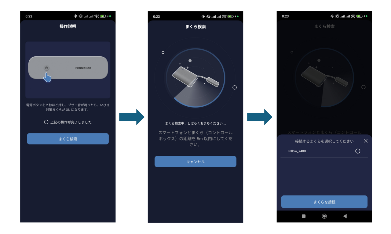 「いびき対策枕シレア」アプリ(Android/iOS対応)で初期設定を行っているところ