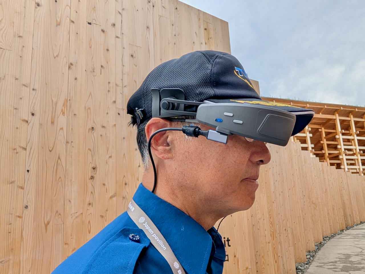 日本館の警備員は“スカウター型”のヘッドマウントディスプレイを装着