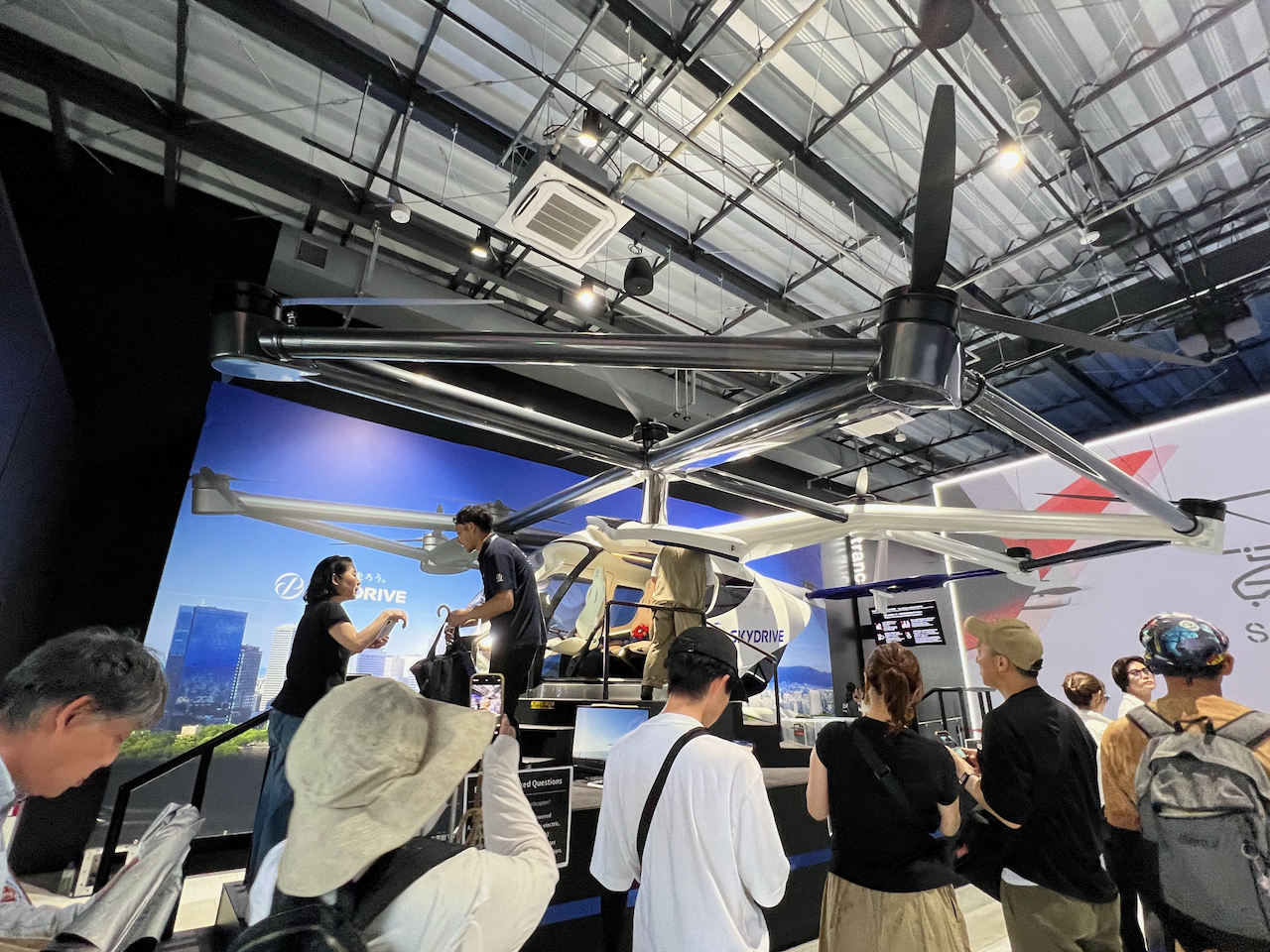 3人乗りの「SkyDrive」は、日本メーカーとして唯一の型式認証(航空機の設計が国の安全・環境基準に適合していると認める制度)を取得しています。会場ではデモ飛行とともにフルサイズのモックアップ試乗や、VRでの飛行体験も用意されました。