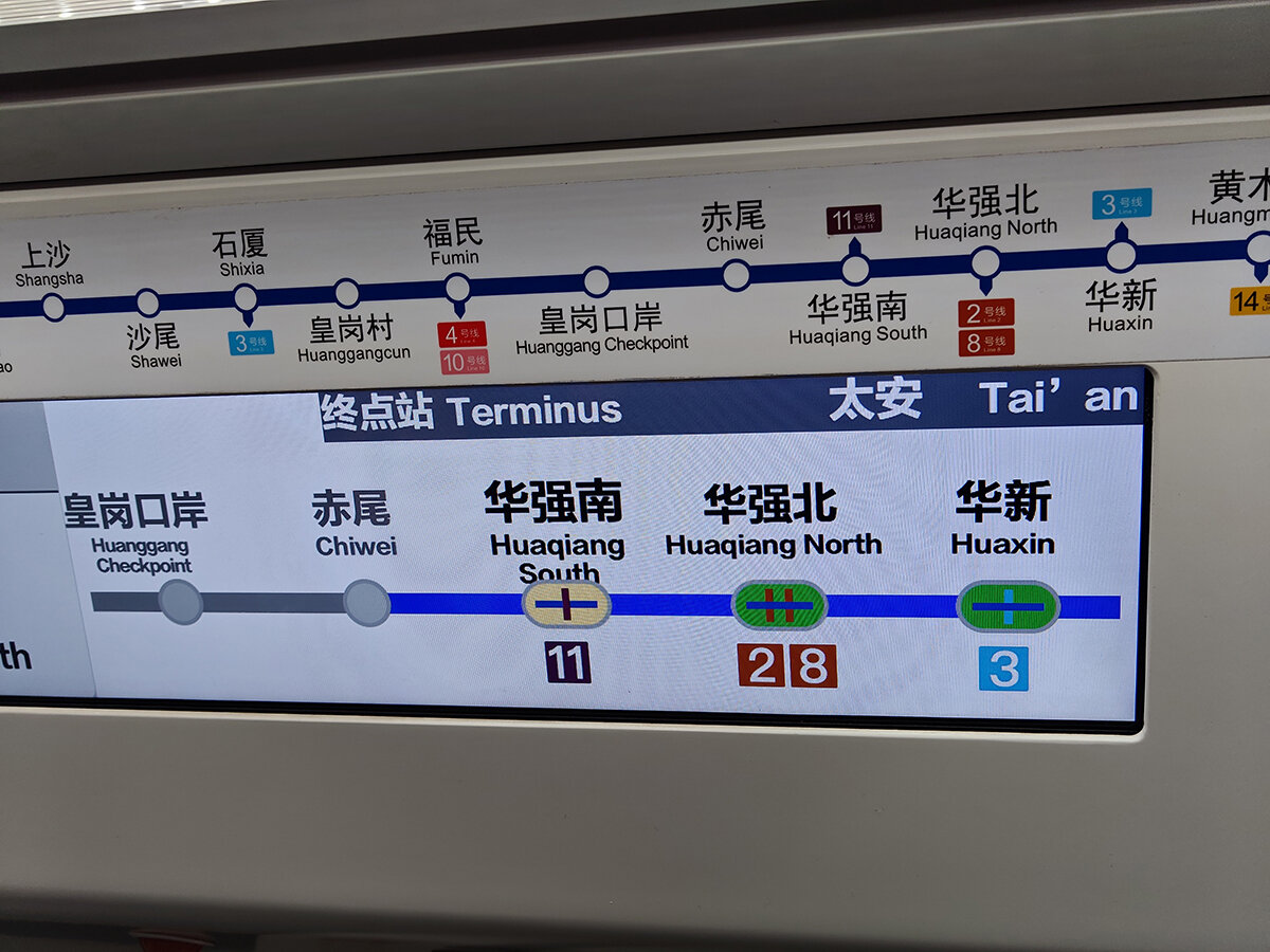 地下鉄はここから電脳街へと走り、駅は赤尾(チーウェイ)、華強南(ファーチャンナン)、華強北、華新(ファーシン)の順に並ぶ。このうち華強南はスマートフォンのパーツビルが近い。このパーツビルに潜り込んでiPhoneの非正規パーツを買い集め、ビル1階のマクドナルドでiPhoneを組み立ててしまうツワモノもいるらしい。華強北は電脳街の中心駅、華新は電脳街の最北端に位置する。