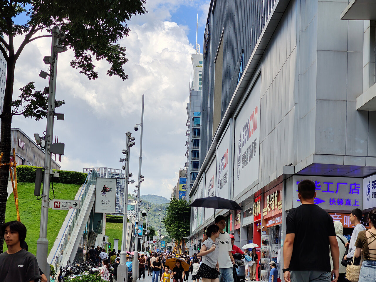 電脳街の華強北路は完全歩行者道路で、ところどころに緑地があり、最新の科学技術と自然が融合した街並みとなっている。もともと4車線道路だったため幅が広く、道の両側にはIT製品関連(といってもほとんどがスマートフォン関連だが)の小売店が入るビルが軒を連ねているのだ。