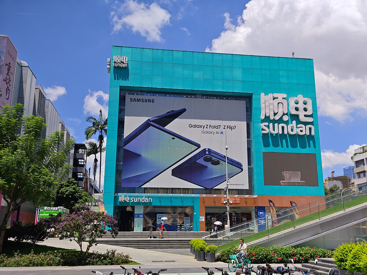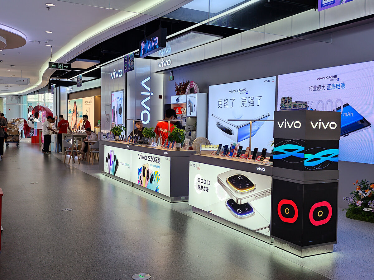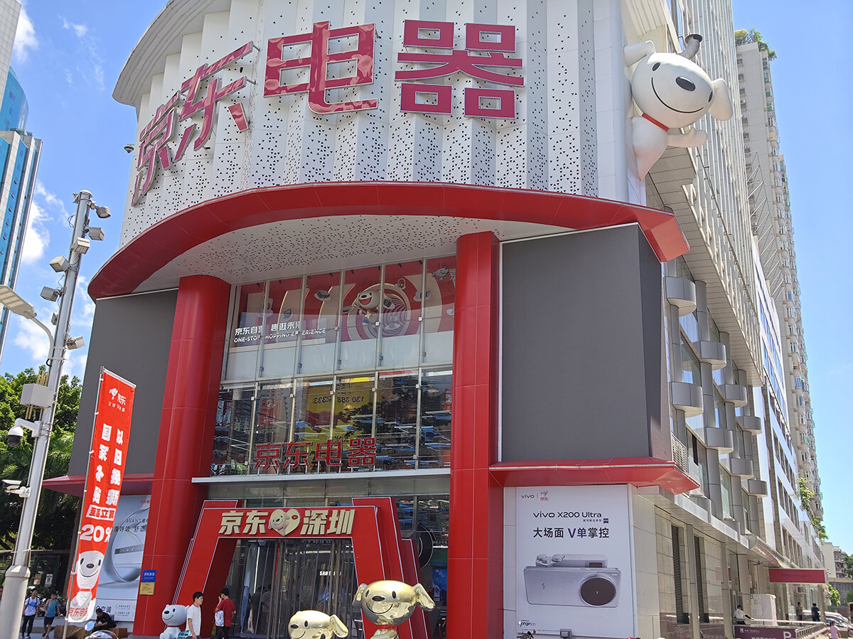 このエリアの家電量販店は、北側から京東電器(ジンドンデンチー/JD)、順電(シュンデン)、蘇寧易購(スーニンイーゴウ/Suning)の3つ。それぞれの店内には各スマートフォンメーカーのブースが設けられ、製品が展示されている。メーカー直営店よりも店員さんの声がけやマークが緩いため、自分のペースで自由に試せるのが魅力。