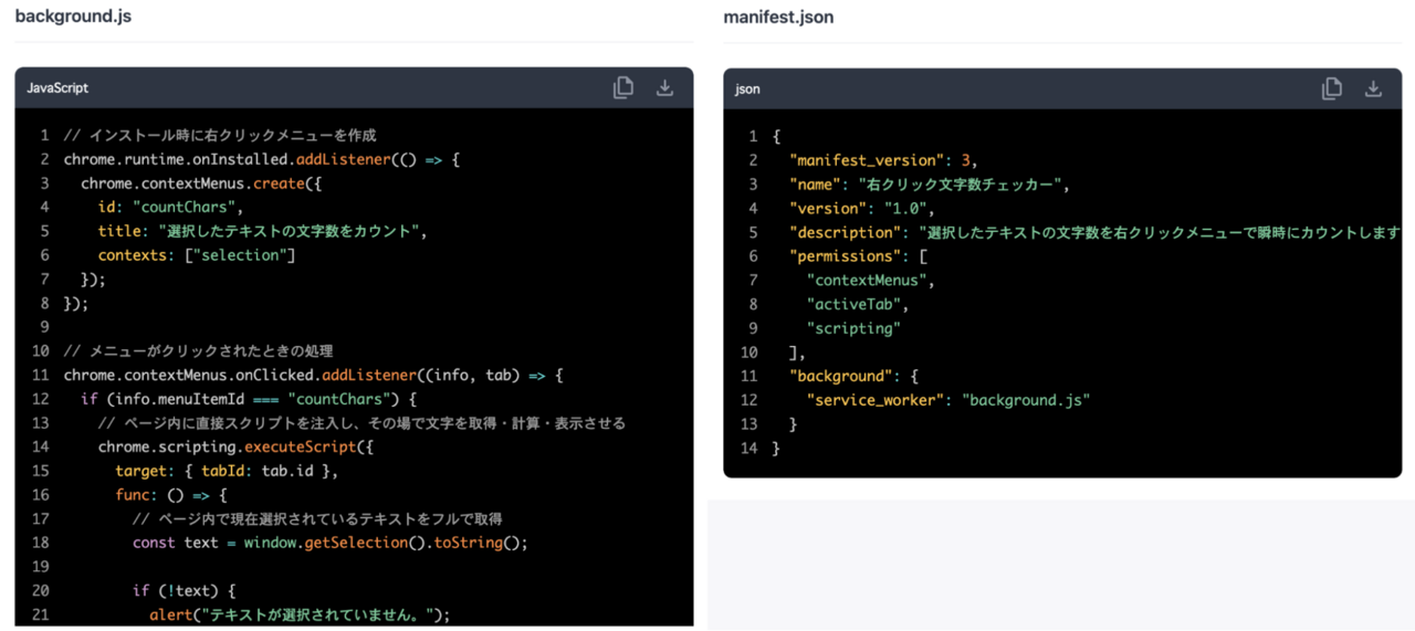 先ほど作った「word_counter」フォルダの中身を、以下の2つの内容で上書きして保存します。Chromeの拡張機能画面で「更新(円の矢印マーク)」を押すだけで完了です。