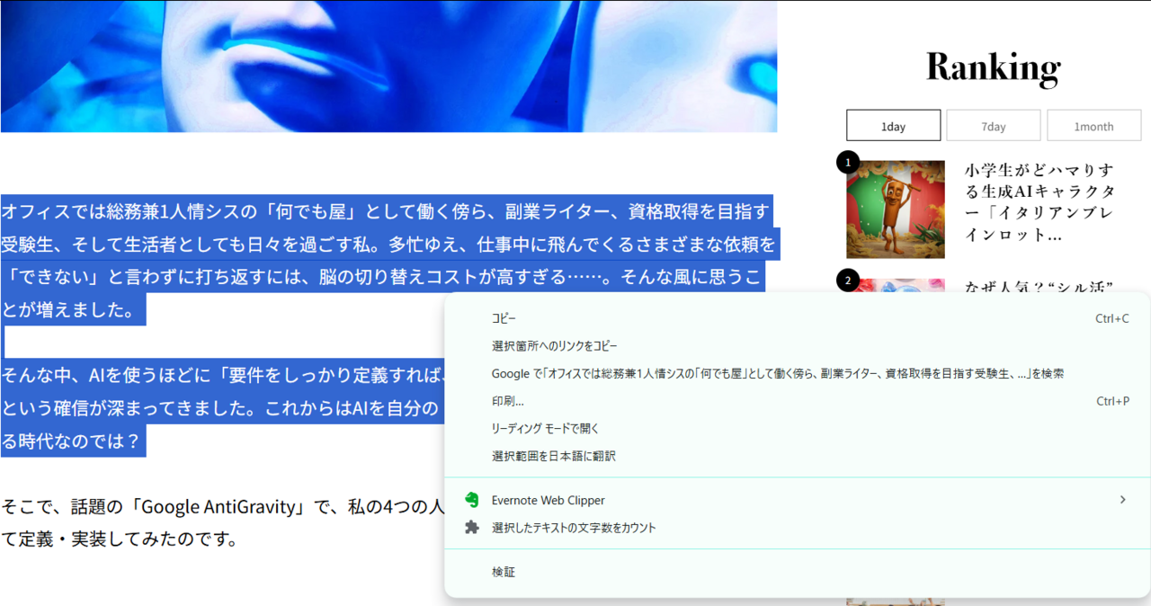 試しに、適当なウェブサイトでテキストをなぞって右クリックすると、「選択したテキストの文字数をカウント」というメニューが出現しました。