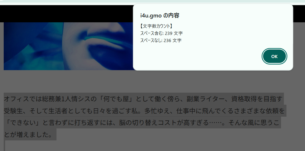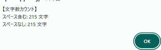 alert(`【文字数カウント】\nスペース含む: ${withSpaces} 文字\nスペースなし: ${withoutSpaces} 文字`);