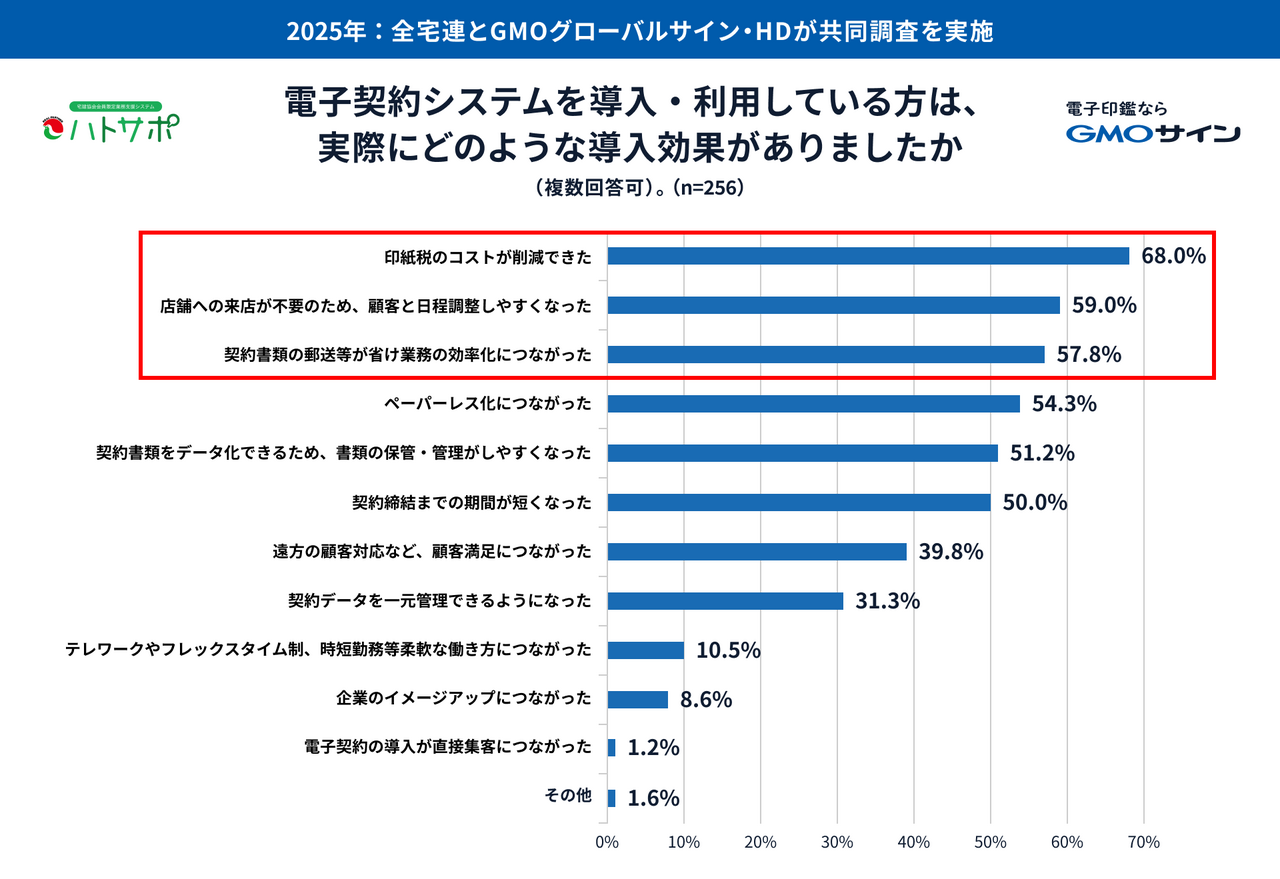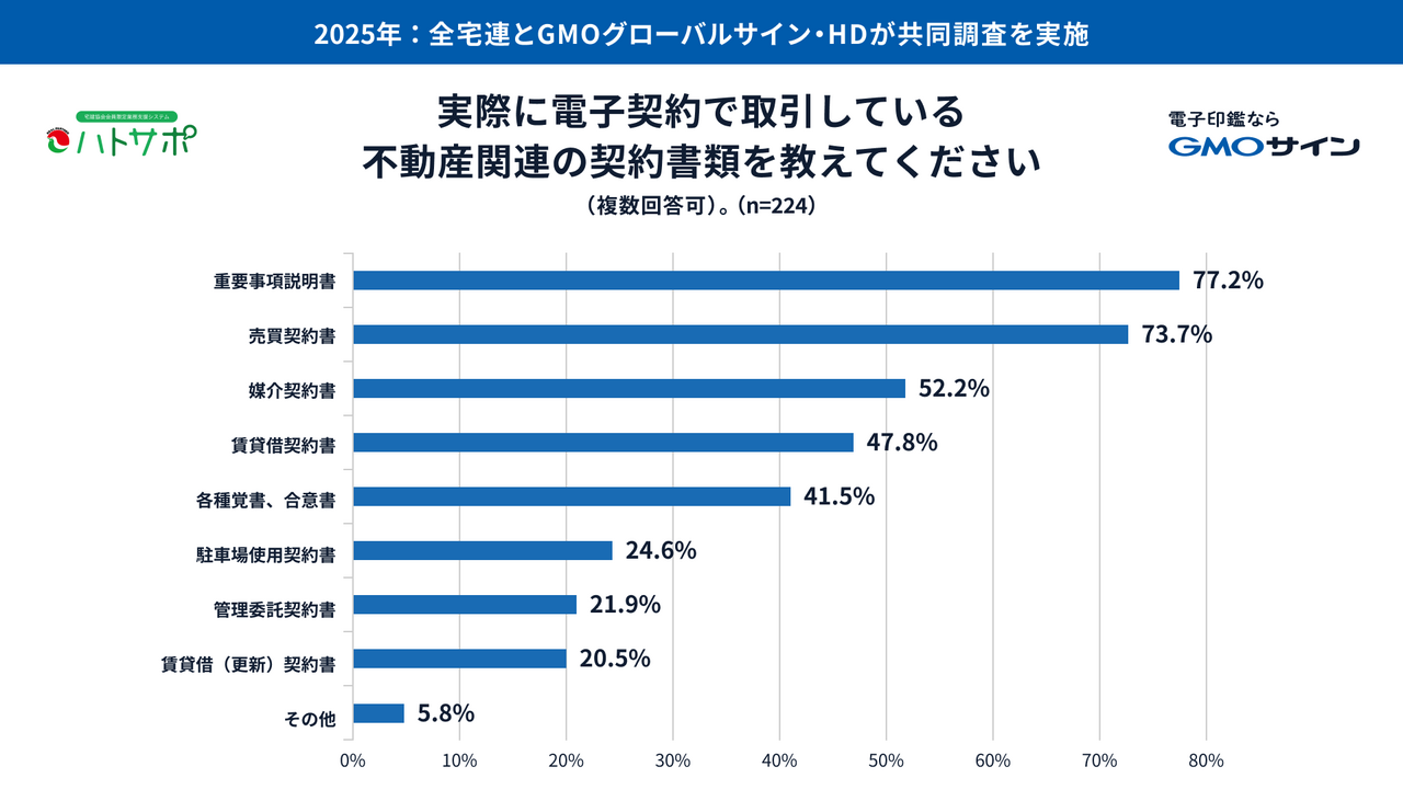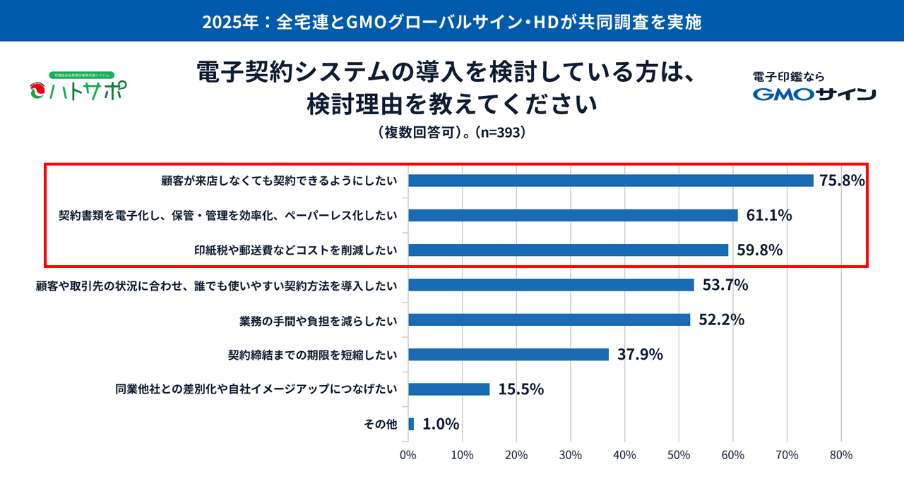 電子契約サービス「電子印鑑GMOサイン」を提供するGMOグローバルサイン・ホールディングスと、宅建協会会員業務支援サイト「ハトサポ」を運営する全国宅地建物取引業協会連合会は、2025年9月に不動産取引における電子契約の実態に関する共同調査を、不動産事業者へ対象に実施しました。