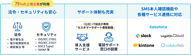 電子帳簿保存法や建設業法などの各種法令に加え、国内外の第三者機関によるセキュリティ認証の取得により、高い安全性を評価されているほか、SMSによる本人確認機能や他の業務サービス・基幹システムとの連携、導入時の支援サービスや電話サポート窓口の設置等、誰もがご利用いただけるサポート体制も充実しています。