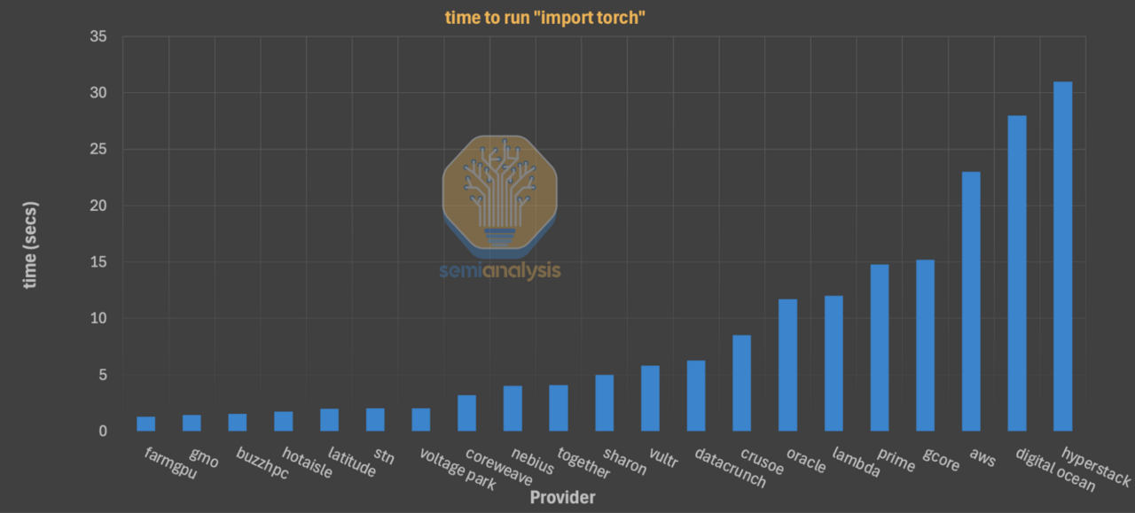 SemiAnalysisによる実測テストで、GMO GPUクラウドは主要GPUクラウドプロバイダーの中でPyTorchライブラリ(AI開発で世界標準のソフトウェアライブラリ)の起動時間が約1秒という結果になりました。開発者の作業効率を示す重要な指標となるPyTorchライブラリの起動時間は、GPUクラウドプロバイダー「FarmGPU」と並んで「near-instant(ほぼ瞬時)」の基準を満たし、最速クラスのパフォーマンスです。これら結果は、適切なシステム構成と最適化された開発環境を示す重要な指標となります。