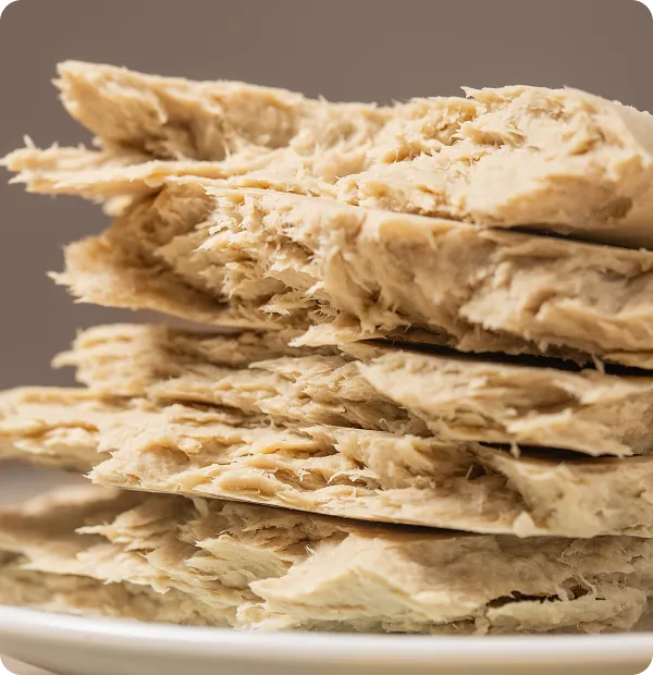 さらにマイコプロテインの強みとして一つ、加工の自由度が挙げられる。富祥生物は、湿潤タイプや粉末タイプ、ブロック状など、複数形態の原料を提供しており、用途に応じて使い分けが可能だ。