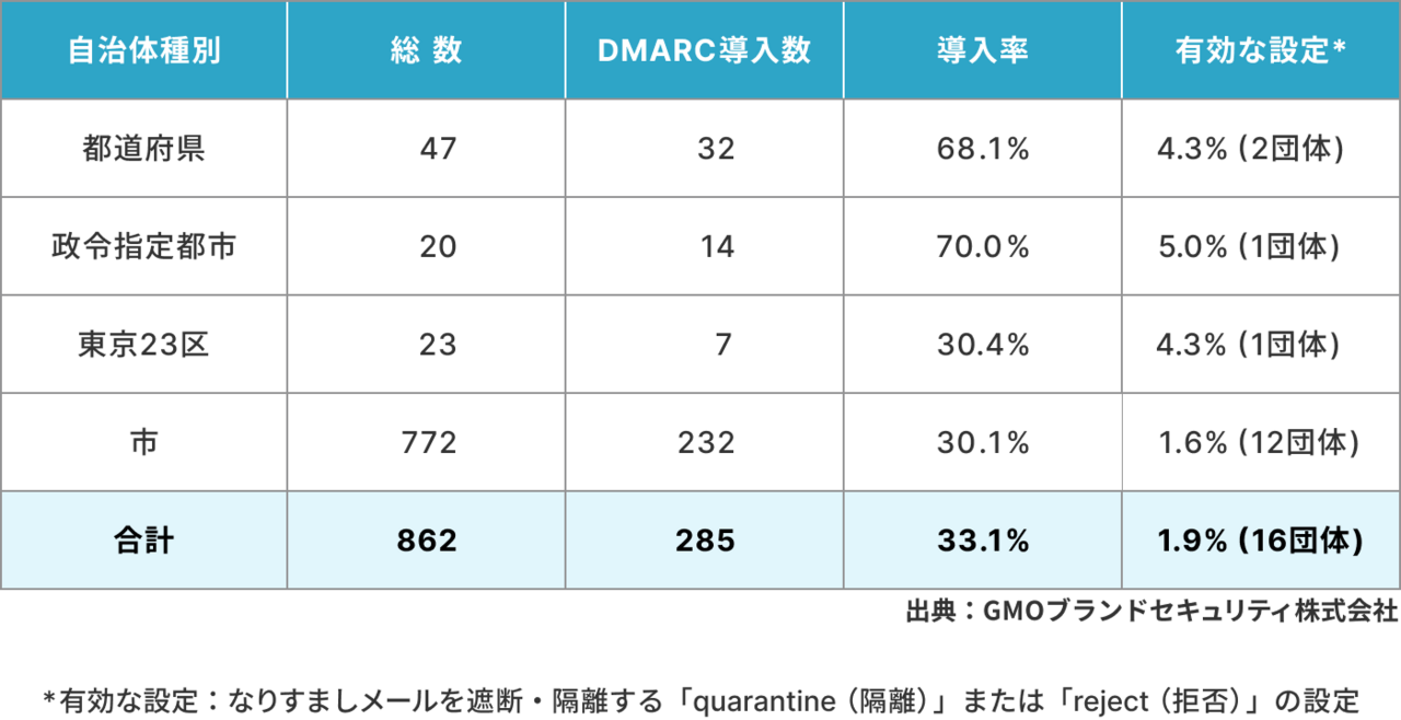 GMOインターネットグループのGMOブランドセキュリティは、ドメイン末尾が「.lg.jp」の全国の自治体862団体を対象に、送信ドメイン認証技術「DMARC(Domain-based Message Authentication, Reporting, and Conformance)」の導入状況に関する調査を実施しました。