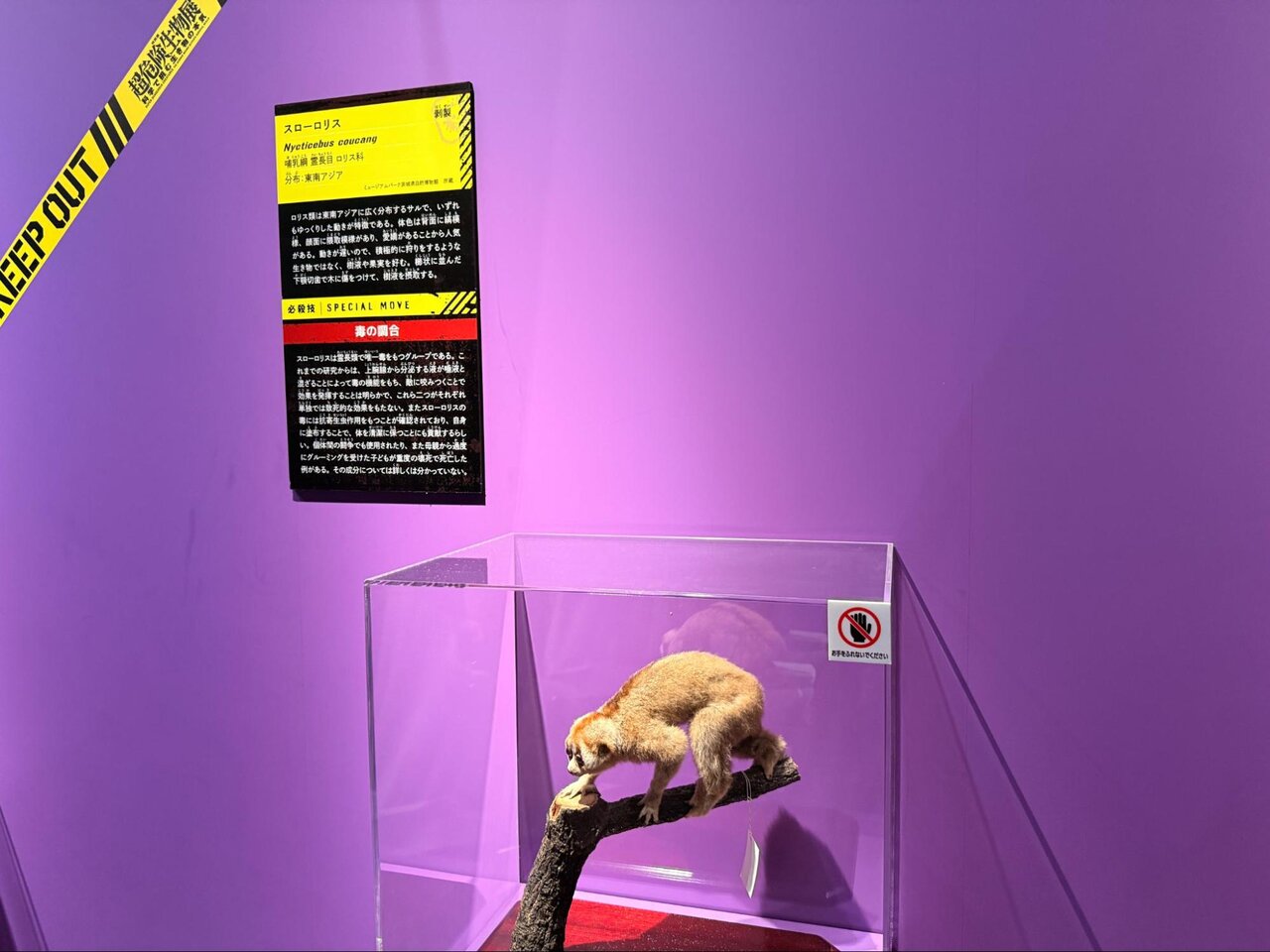 霊長類で唯一毒を持つというスローロリスの必殺技は「毒の調合」。その小さな手で毒をコネコネするわけではないが、不思議&厄介な仕組み。そして猛毒型コーナーの壁は毒々しい紫色!