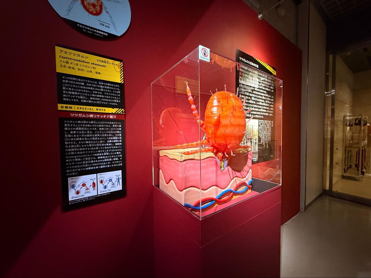 特殊攻撃系の吸血型で展示されていたアカツツガムシの巨大模型と、ツツガムシ病の解説。発症までのイヤ〜な感じの過程とともに、ツツガムシの何がどう怖いのかよくわかった