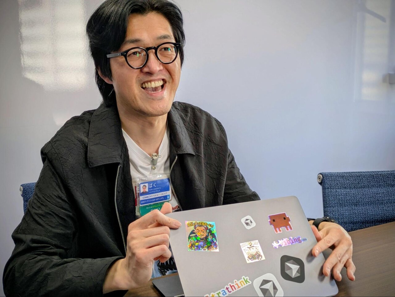 Cursorを開発するアメリカのAnysphereから「よければ勉強会で配ってください」と提供されたという“Cursorステッカー”など、お気に入りのAIステッカーを自慢し、この日一番の笑顔を見せるパク氏