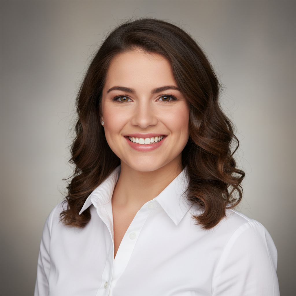 プロンプト:「A friendly young woman with shoulder-length brown hair, wearing a white business shirt, smiling, professional headshot style, neutral background(肩までの長さの茶色の髪をした、フレンドリーな若い女性。白いビジネスシャツを着て微笑んでおり、プロフェッショナルな顔写真スタイルで、背景は無地か控えめ)」
