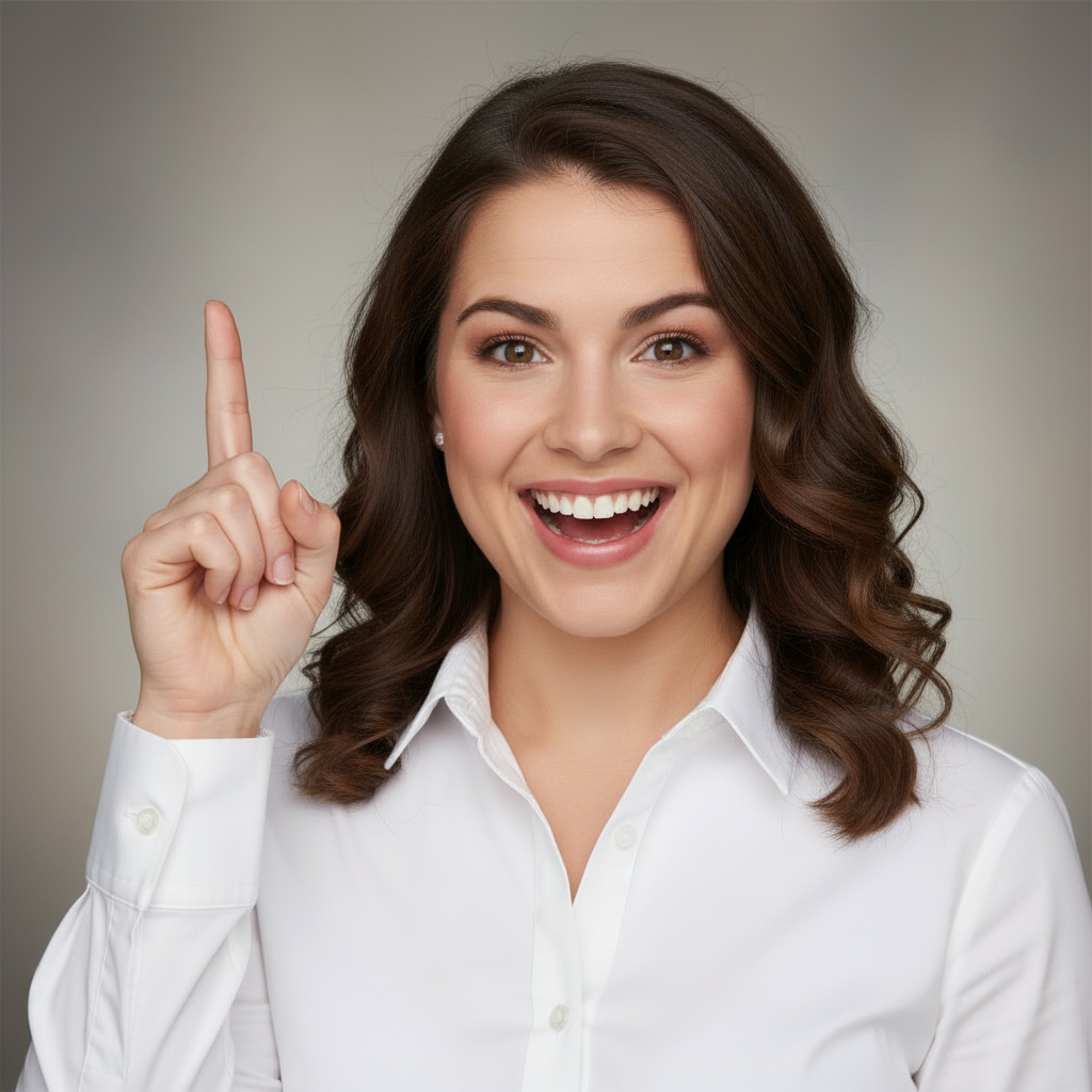 プロンプト:「Change this person to be pointing upward with her finger, excited expression, same person same face same hair same clothing, just different pose and expression(この人物が指で上を指し、興奮した表情になるように変更してください。同じ人物、同じ顔、同じ髪型、同じ服装で、ポーズと表情だけを変更してください)」