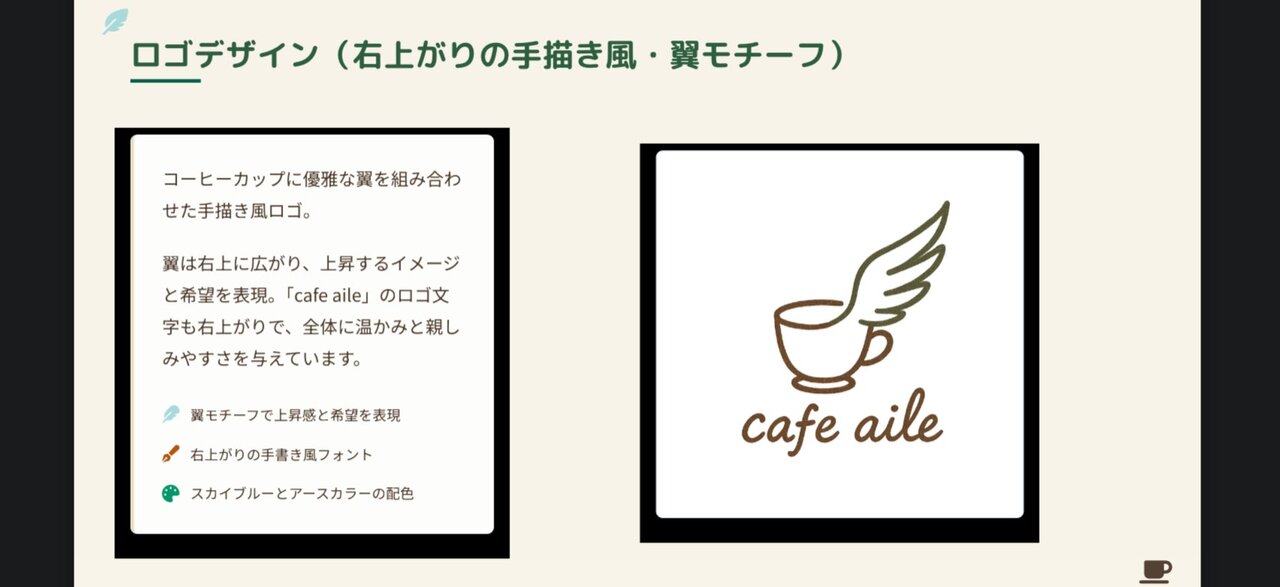 例えば、新しくオープンするカフェのロゴデザインやコンセプトを考えてほしいと頼んでみると、このようなスライドが生成されます。