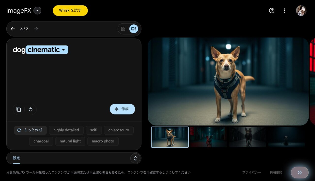 ImageFXを開いて「犬」と入力すると、画面下部に小さなタグが現れます。