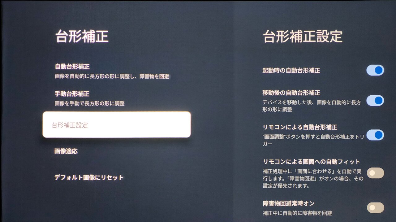 これらの自動調節機能は、人が前を通ったりした際にも動作する場合があります。そのため、常設できる場所がある場合は、どちらもオフにしておく方が挙動は安定します。モバイルプロジェクターの場合、ちょっとした揺れなどで自動調節機能がいちいち動作してしまう場合もあります。TK705STiの場合はそうした誤動作を感じることはありませんでした。重さがあるため揺れに強い部分もあると思いますが、敏感すぎず鈍感過ぎないあんばいがちょうどよく感じました。