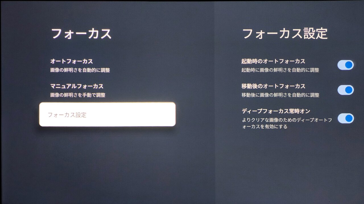 Google TVのプロジェクター設定メニュー内にあるオートフォーカス機能の設定画面