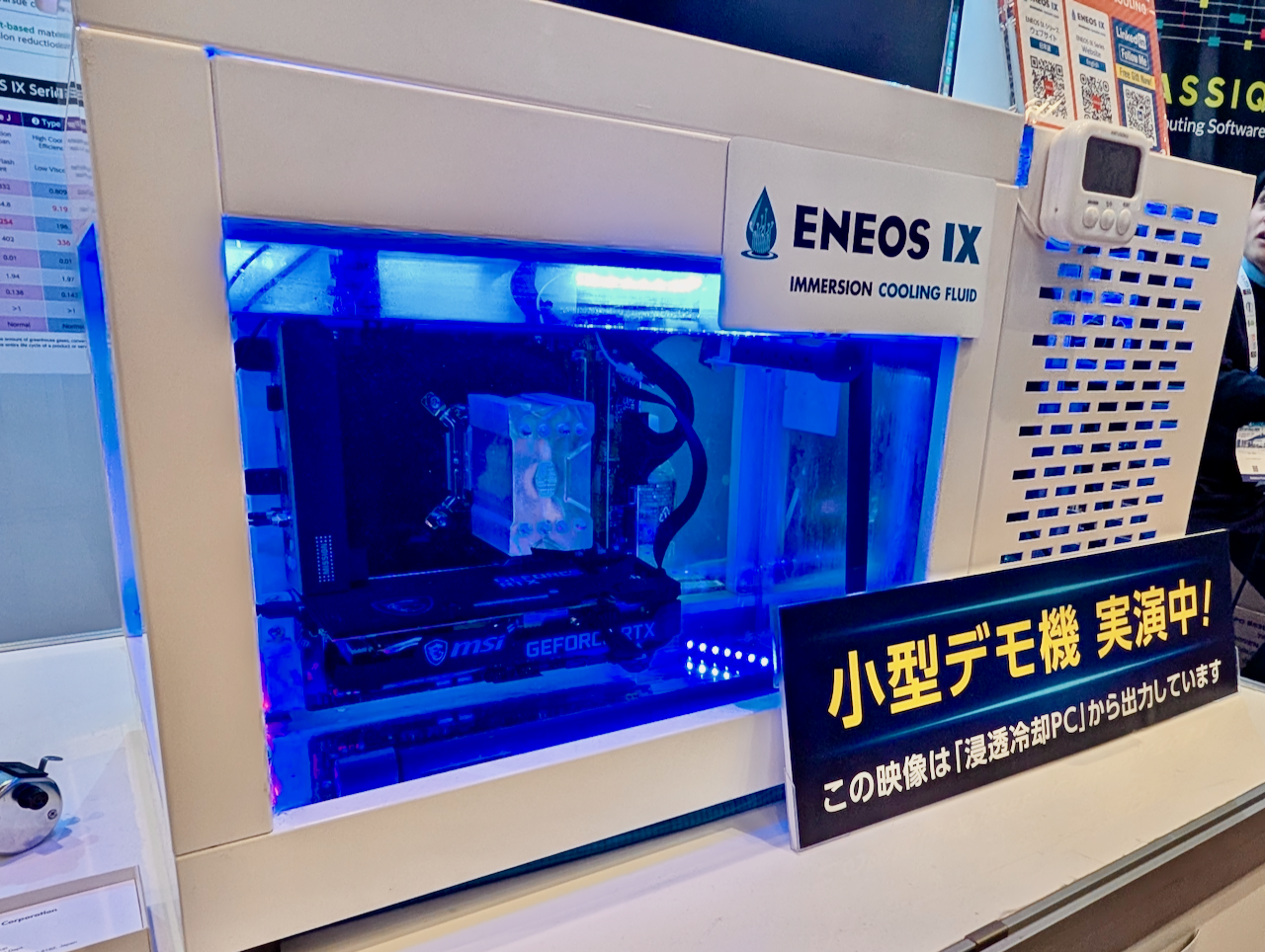 会場では、この冷却液を使用した小型の液浸サーバーも展示されていました。