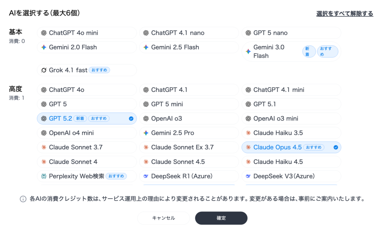 まずはAI選択画面で、比較したいAIサービスを決めます。リリースされたばかりのバージョンもしっかり入ってるので、「見せてもらおうか、Gemini 3の実力とやらを」みたいな気分で選択できます。そのときどきの「おすすめ」も表示されるので、迷ったら、まずはおすすめを選ぶのもよいですね。