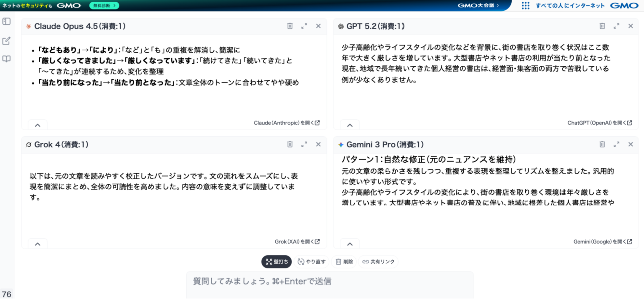 私が選んだAIモデルのうち、「GPT 5.2」はさらっと自然に文章を整えてくれるタイプ。一方「Claude Opus 4.5」は「『などもあり』→『により』」「『厳しくなってきました』→『厳しくなっています』」など、修正箇所を1つずつ説明してくれました。なぜ変えたのかが分かるので、自分の校正スキルを上げたい人にもよさそうです。AIそれぞれに特徴があるのが分かります。