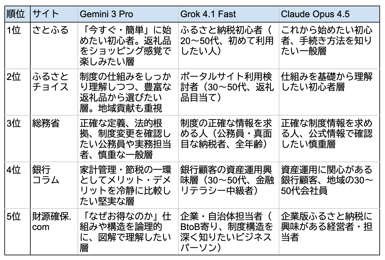 まず各サイトの想定読者像の分析。1〜2位のポータルサイト(さとふる、ふるさとチョイス)は「初心者向け」、3位の総務省は「正確な情報を求める慎重層」、4位の銀行コラムは「資産運用に関心がある堅実層」と、3つのAIでほぼ一致していました。