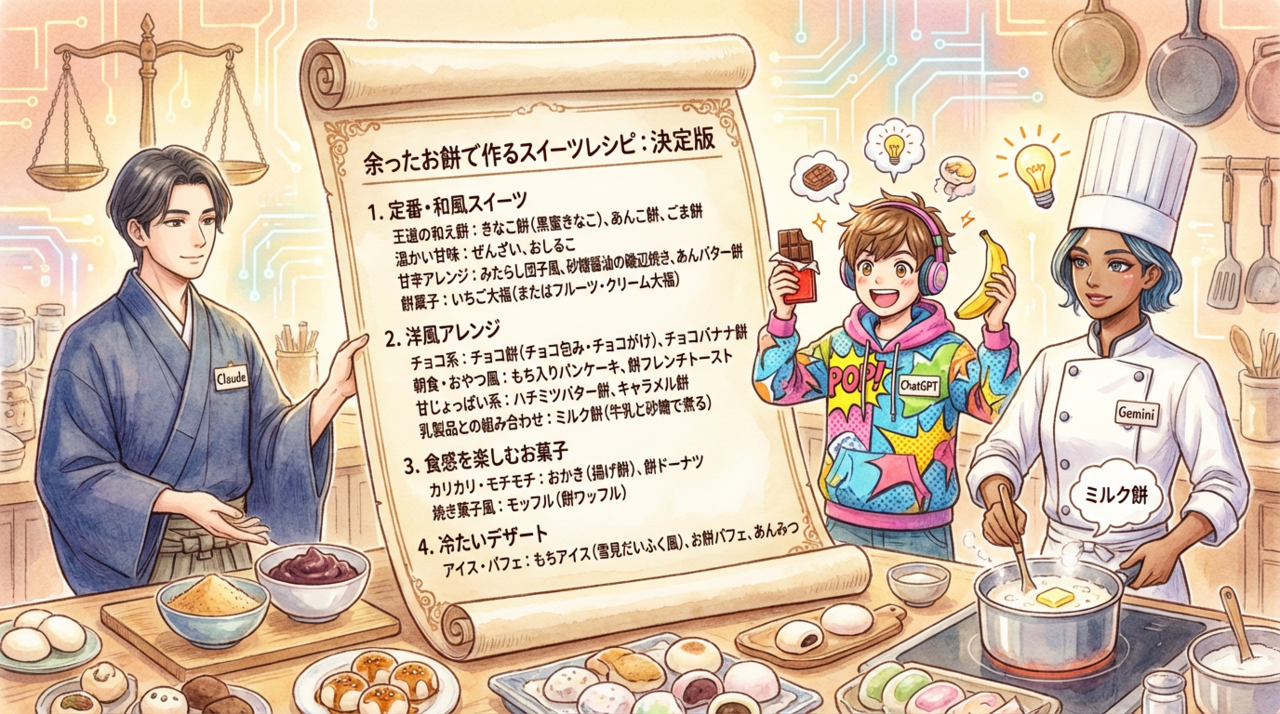 これが天秤AIで作った「餅スイーツレシピ:決定版」。Nano Banana Pro でイラストにしました